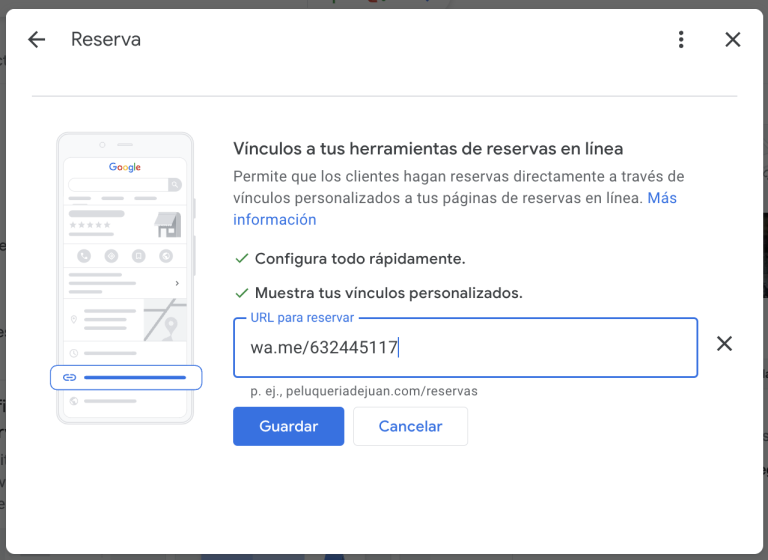 - Acción: Accede a tu cuenta Google My Business, entra en Reservas > Agregar un vínculo.