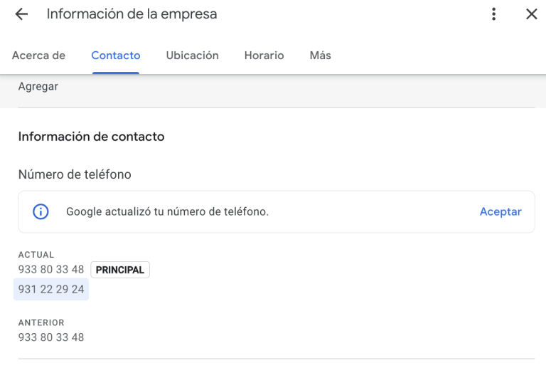 - Acción: Dentro de tu cuenta de Google My Business, ve a Editar perfil > Número de teléfono.